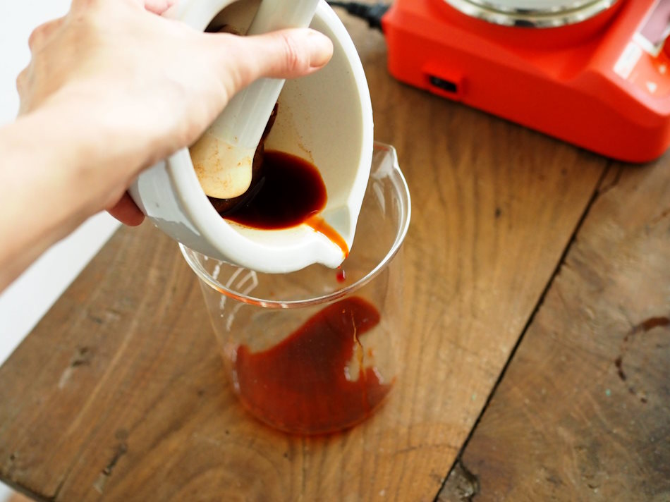 Pour notre dernière recette de laque de garance, nous voulions tester le carbonate de sodium (la soude de nos produits ménagers !) à la place de la lessive de cendre. Cette version est moins proche des recettes médiévales, mais très intéressante à utiliser pour notre travail d’atelier. Cette fois, le filtrage à été plus minutieux en amont. Le pigment obtenu est très foncé et d’une couleur magnifique…