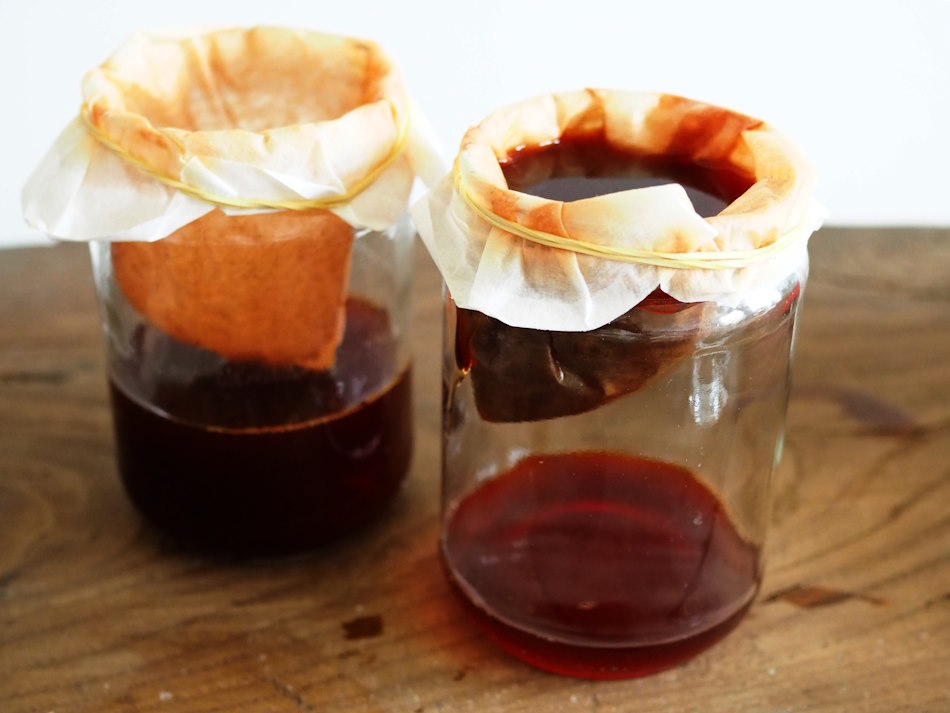 Pour notre premier essai, nous avons suivi une recette de Julien Guignet avec une réaction au carbonate de calcium (nous avons utilisé de la poudre de marbre). Cette recette nous a donné une magnifique teinte, mais le jus coloré à été mal filtré nous a laissé de vilains grains de racines. Le second, sur la même recette à été trop filtré cette fois dans plusieurs tissus très absorbants (et maintenant superbement teintés d’un beau rouge rosé) était devenu trop pauvre de matière colorante et nous a donné un rose très beau mais terriblement fade… Le troisième à fini à la poubelle à cause d’une série d’erreurs au séchage. Notre pigment à tout simplement fermenté et pourri avant de réussir à sécher. C’est au quatrième essai que nous avons enfin obtenu le magnifique rouge profond désiré.