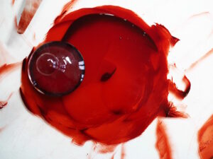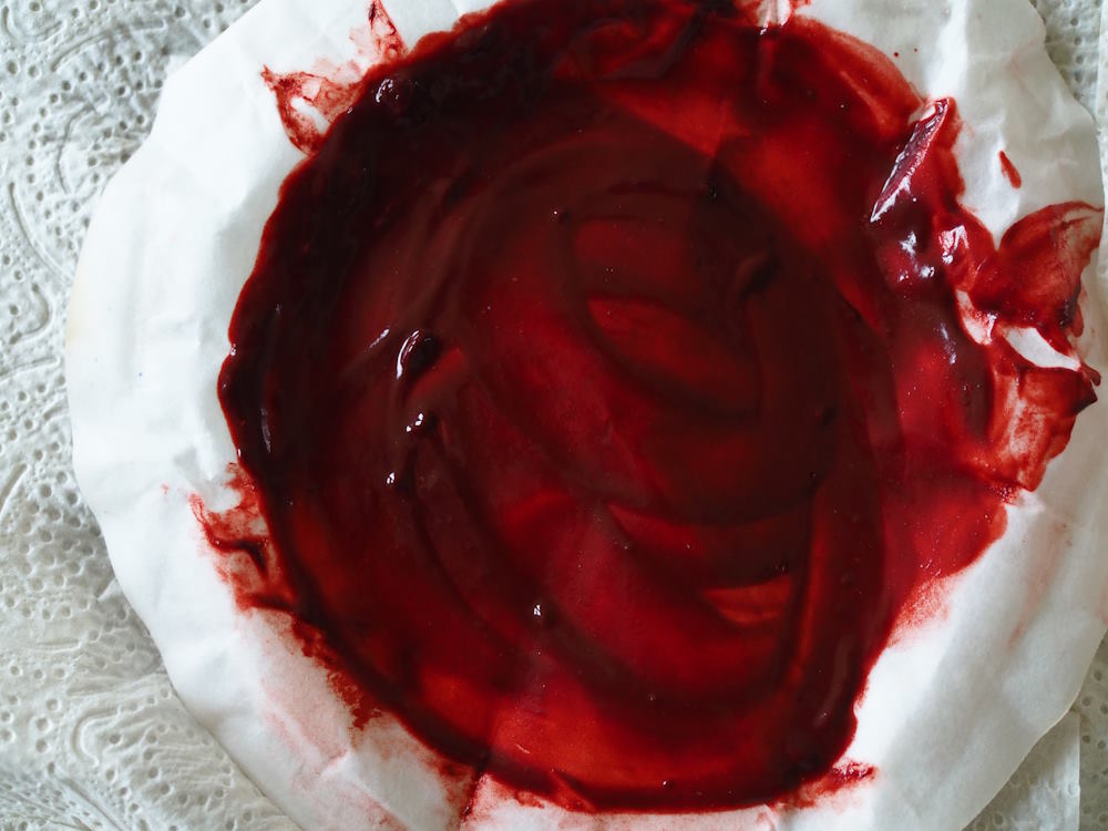 Notre recette numéro 4 se base sur une recette d’Edmond Pelouse (secrets modernes des arts et métiers, 1840). Celle-ci utilise une technique un peu différente en ajoutant une solution acide dans la teinture végétale additionnée d’alun qui va former un précipité. La matière colorée du bain de teinture va alors devenir inerte, insoluble, et va se déphaser de l’eau. Après filtrage, c’est cette matière qui sera notre pigment. Nous avons utilisé pour cette recette de la lessive de cendre et obtenu un très bon résultat et un pigment foncé, translucide et d’un rouge magnifique. Avec malgré tout une granulation encore un peu importante.