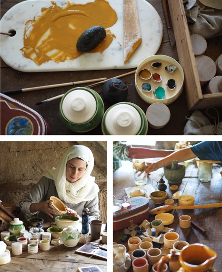 Au programme : En immersion dans le village, nous lors de ces après-midi prendre un moment pour nous pencher sur une technique ou un aspect de la peinture au moyen-âge, et plus précisément des techniques utilisées pour fabriquer des pigments et de la peinture.